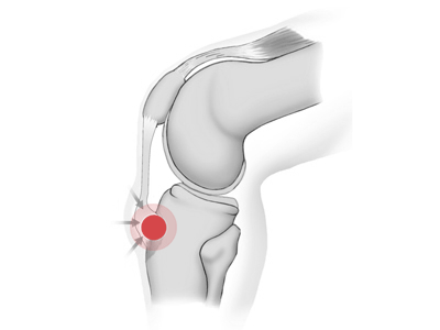 Воспаление точки крепления сухожилия надколенника к большеберцовой кости. В основном это встречается у мальчиков в возрасте от 10 до 16 лет, но также наблюдается среди девочек, которые много тренируются. Причиной возникновения болезни является не только последствие ушиба, падения или физической нагрузки, но и без какого-либо внешнего воздействия начинаются боли при сильном разгибании или крайнем сгибании колена, развивается ограниченная, плотная, резко болезненная при надавливании припухлость большеберцового бугра. Факторы риска развития болезни Осгуда — Шлаттера: баскетбол, хоккей, футбол, акробатика, волейбол, лыжные гонки, лёгкая атлетика, тяжёлая атлетика, ирландские танцы, балет, кикбоксинг, горные лыжи, спортивный туризм, большой теннис, дзюдо, самбо, гимнастика, кёрлинг, бальные танцы, велоспорт, гандбол. Проблема возникает спонтанно, без видимых на то причин. Болезнь хорошо поддается лечению, но для полного излечения может потребоваться несколько лет.