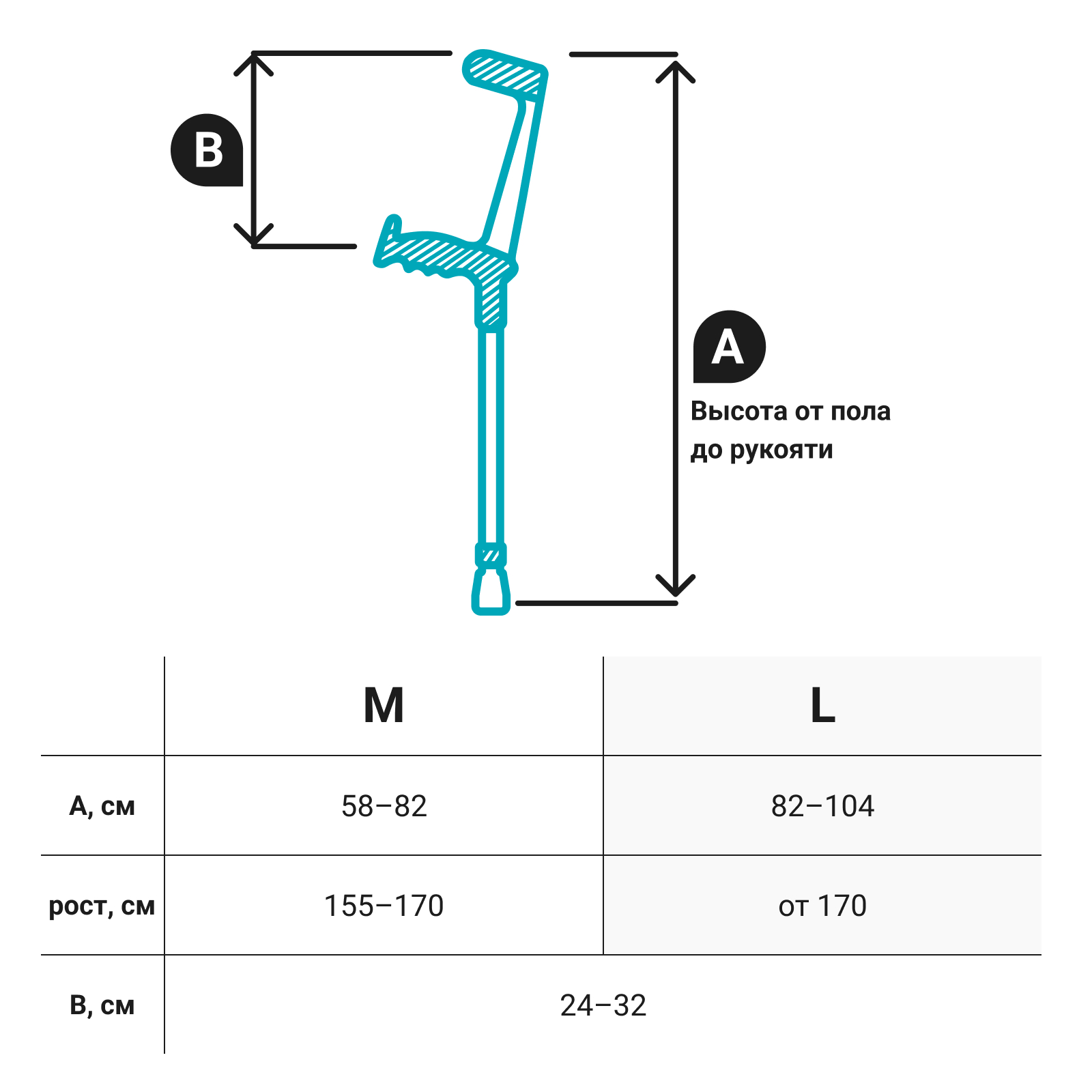 Высота от рукояти до опоры под локоть 24–32 см (размеры M и L).