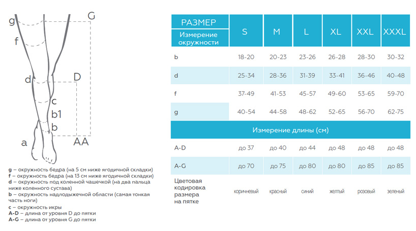 Обратите внимание! При подборе размера гольфов, чулок и колгот руководствуйтесь приведенными здесь таблицами. Измерения нужно проводить утром, до появления отеков на ногах.