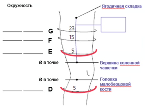 Измерьте окружность в указанном месте, начиная на 5 см выше вершины коленной чашечки точка Е и продолжая на 5 см ниже головки малоберцовой кости точка D. Запишите в соответствующие строки E и D