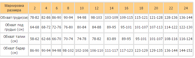 Таблица размеров: