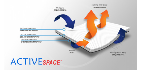 ActiveSpace™ это полиамидный объемный материал 3D, очень легкий, вентилирующий кожу, состоящий из 2 слоев. Между ними находится объемный ажурный материал из полиамида шириной 4 мм. Специфика этого материала в том, что он неэластичен, поэтому хорошо стабилизирует. Внутри между слоями свободно циркулирует воздух. Материал водостойкий.