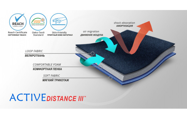 ActiveDistance III - активный трехслойный материал, состоящий из очень прочной нерастягивающейся обложки из полиамидной велкроткани, комфортной пенки и хлопчатой махровой подкладки, которая поддерживает нужный микроклимат около кожи и эффективно отводит пот. Подкладка приятная для кожи. Поверхность для липучек велкроткани существенно облегчает использование ортезов изготовленных из этого материала.