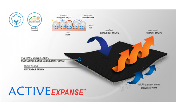 Боковые части изготовлены из ActiveExpanse-это очень легкая двухслойная объемная ткань со структурой 3D с хорошей циркуляцией воздуха и отводом пота от тела. Внешний слой из полиамидной объемной ткани 3D с повышенной механической прочностью и гипоаллергенными свойствами, внутренний слой из приятного для кожи хлопчатого трикотажа, имеющего сертификат Oeko-Tex Standard 100. Материал ActivExpanse отличается тем, что он неэластичный, таким образом улучшает стабилизацию. Изделия из этого материала очень комфортные.