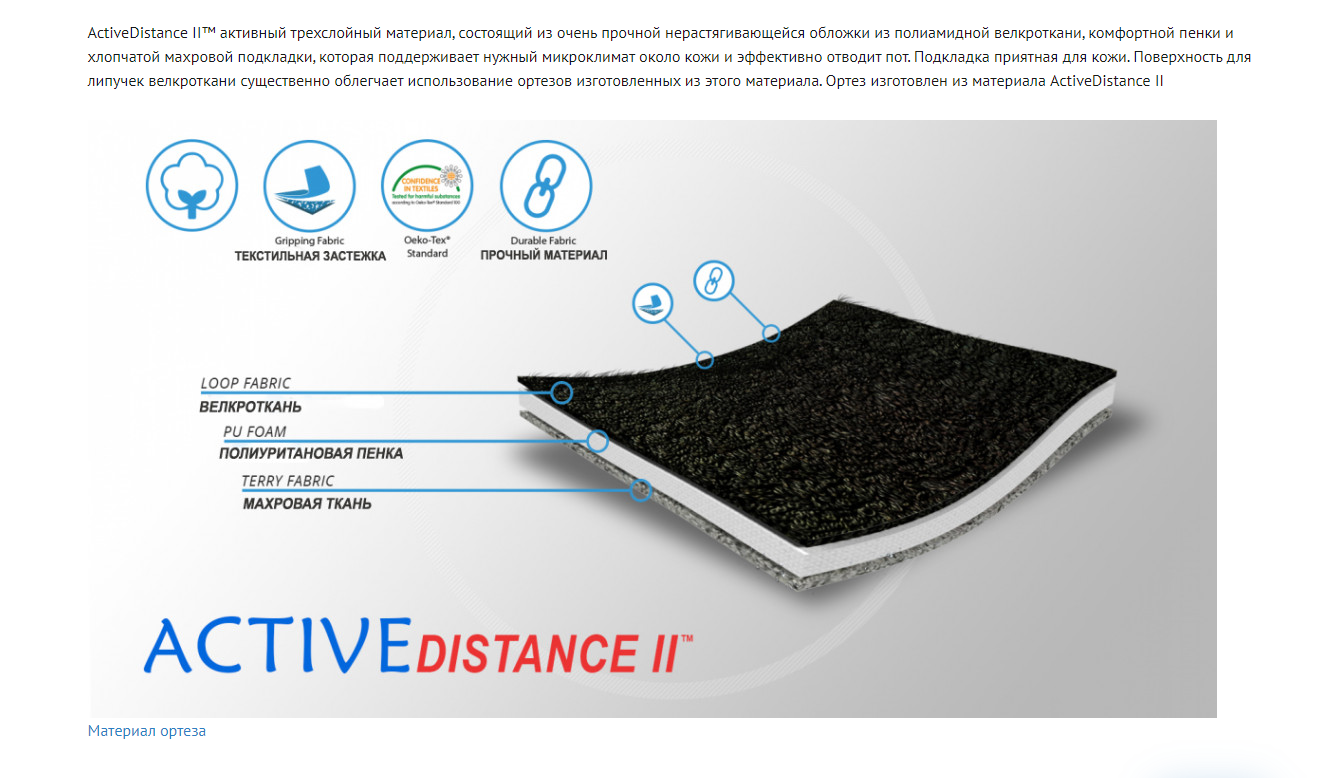 Настройка механизма осуществляется с помощью имбусовых шурупов, что защищает изделие от случайных изменений положения элементов. Шина фиксируется в области бедра и голени на двух рукавах, выполненных из многослойного материала ActiveDistance II.