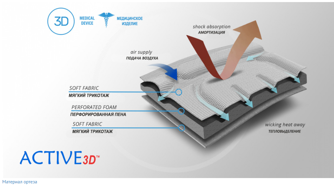 Active3D™ представляет собой термоформованный материал из специального вспененного сырья с закрытоячеистой структурой. Этот материал отлично защищает тело от давления таких элементов, как шины и ортопедические жесткие вставки, является водонепроницаемым, не впитывает пот и очень легко чистится. Благодаря этим свойствам он идеально подходит для изготовления специализированных ортопедических изделий. Может иметь различные типы внешней облицовки, в том числе обивки с самоклеящимися функциями. Он обладает термоформовочными свойствами, благодаря чему ему можно придать форму и функциональность, необходимые для изготовления ортеза данного типа.