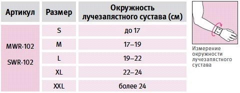 Для правильного выбора подходящего размера лучезапястного бандажа Orlett MWR-102 необходимо сантиметровой лентой измерить окружность лучезапястного сустава. Далее воспользоваться размерной таблицей, представленной ниже: