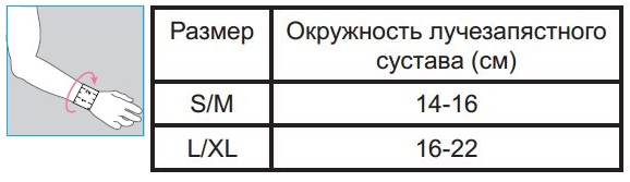 Для правильного выбора подходящего размера лучезапястного бандажа Orlett RWR-102 необходимо сантиметровой лентой измерить окружность лучезапястного сустава. Далее воспользоваться таблицей, представленной ниже: