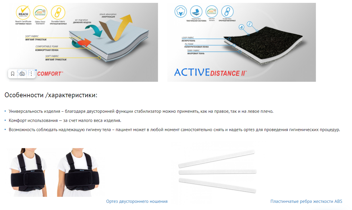 Ортез AM-SOB-02 состоит из двух частей: опорного элемента, поддерживающего верхнюю конечность с защитными ограждениями, изготовленного из сырья CottonComfort™, и кольцевого пояса, обеспечивающего дополнительную стабилизацию из инновационного сырья ActiveDistance II™. Материалы не эластичны для лучшей стабилизации конечности. ActivDistance II™, за счет внутреннего слоя из махровой подкладки, поддерживает нужный микроклимат около кожи и эффективно отводит пот.