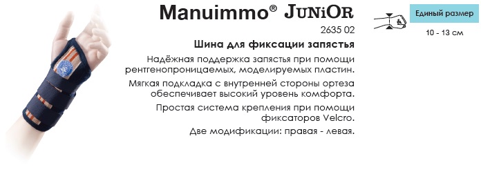 Купить mANUIMMO® JUNIOR Шина для фиксации запястья детская с доставкой в Санкт-Петербурге в интернет салоне Med V Rus по цене 3 250 руб.. Скидки до 25%. Доставка и самовывоз из пункта выдачи товаров. Оплата наличными или картой. Телефон для заказов +7(812)648-4512.